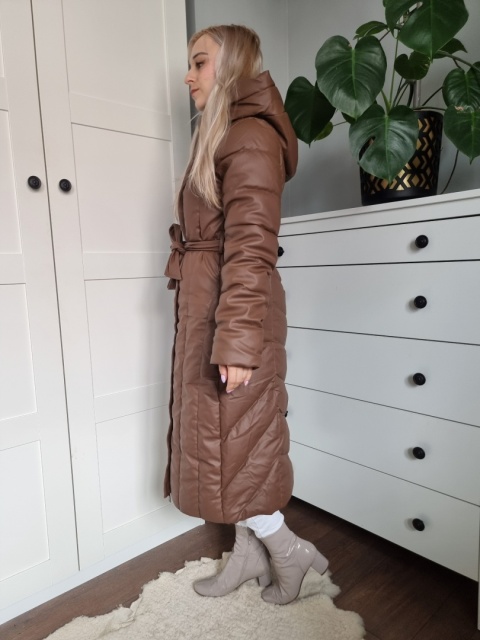 Czekoladowa kurtka płaszczyk zimowa ekoskóra pikowana taliowana kaptur