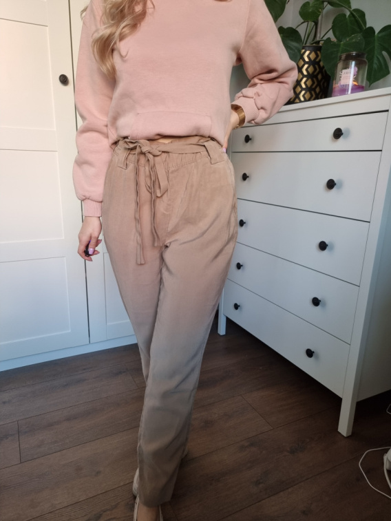 Kamelowe spodnie z wiązaniem w talii, wykonane z lekkiej i przewiewnej wiskozy – idealne na wiosenne dni. Luźny, swobodny krój zapewnia wygodę i elegancki wygląd, a regulowane wiązanie podkreśla sylwetkę. Dzięki oddychającemu materiałowi spodnie świetnie sprawdzą się zarówno na co dzień, jak i w bardziej stylowych zestawach. Połączenie komfortu i klasycznej kolorystyki sprawia, że to must-have w każdej wiosennej garderobie!