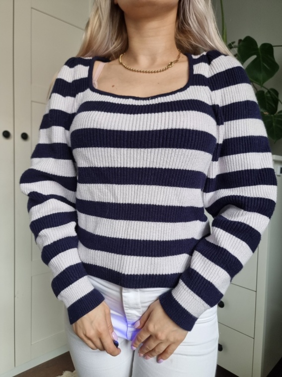 Sweter w paski koloru ggranatowego i złamanej bieli. Posiada bufki na ramionach.