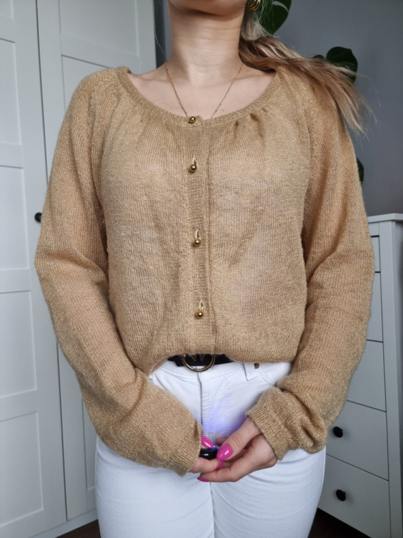 Elegancki sweter wykonany z wysokiej jakości moheru (60%) z dodatkiem innych włókien, zapewniający miękkość, komfort i ciepło. Model wyróżnia się stylowymi, złotymi guzikami, które dodają mu klasy i szyku. Sweter ma uniwersalny krój, który doskonale pasuje zarówno do casualowych stylizacji z jeansami, jak i do bardziej formalnych zestawień z eleganckimi spodniami czy spódnicą. Idealny na chłodniejsze dni, kiedy chcesz czuć się jednocześnie wygodnie i modnie.