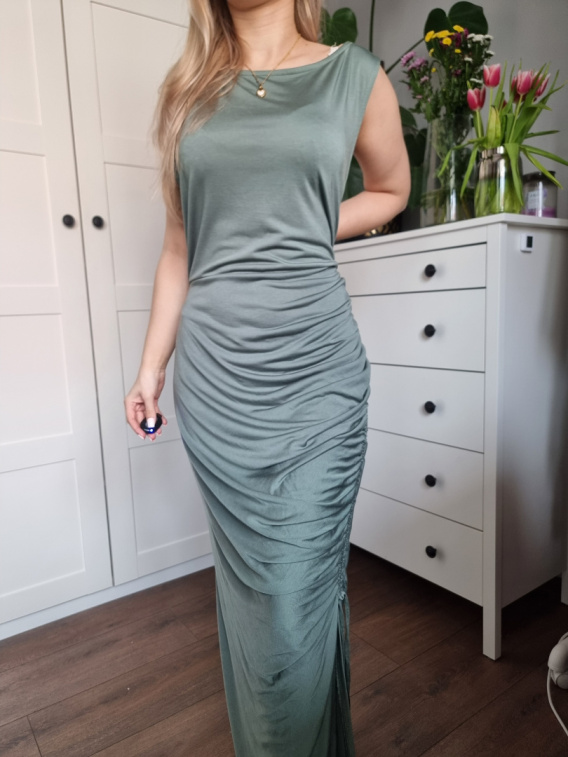 Szałwiowa maxi dress, marszczenie, podkreśla sylkwetkę, elegancka, r. XL