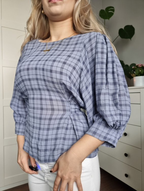 Wiskozowa bluzka w kratkę z bufiastymi rękawami i wiązaniem z tyłu